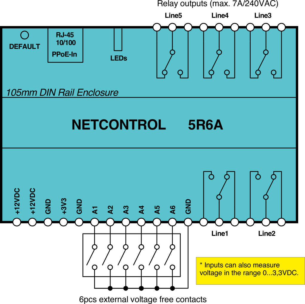This model is equipped with a special housing for mounting on a standart DIN rail. 6 alarm inputs are available plus 5x relay SPDT outputs. All input-output circuits are accessible via screw terminals.